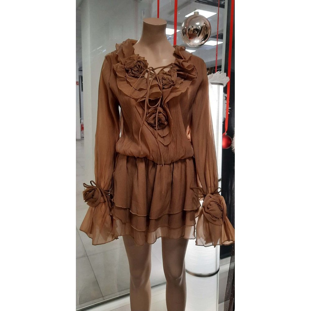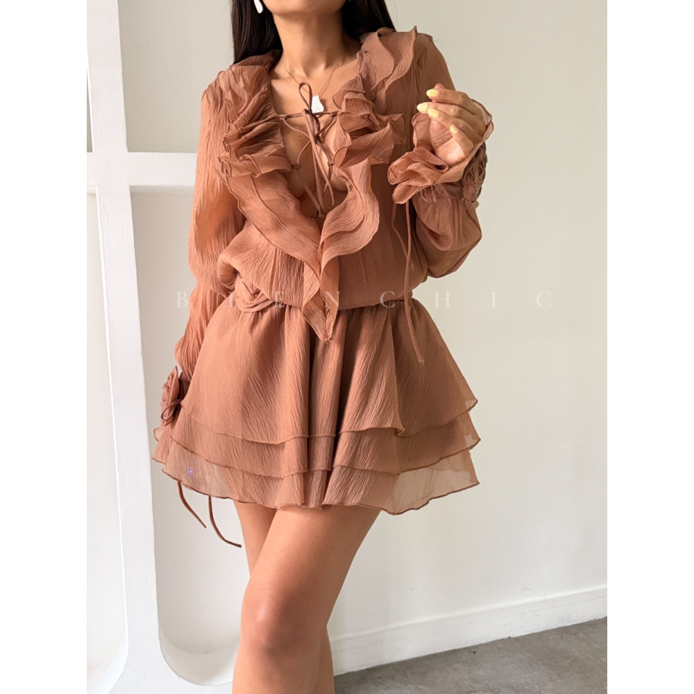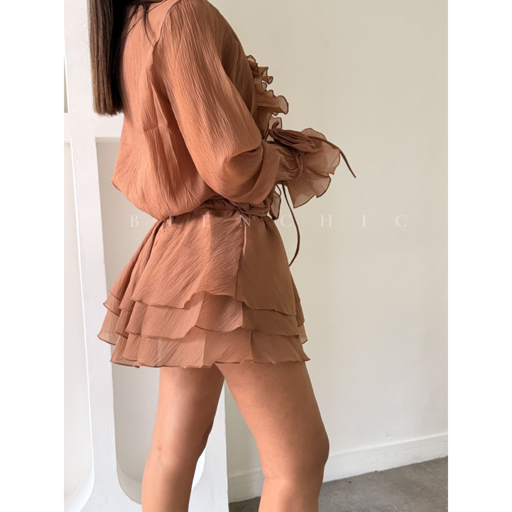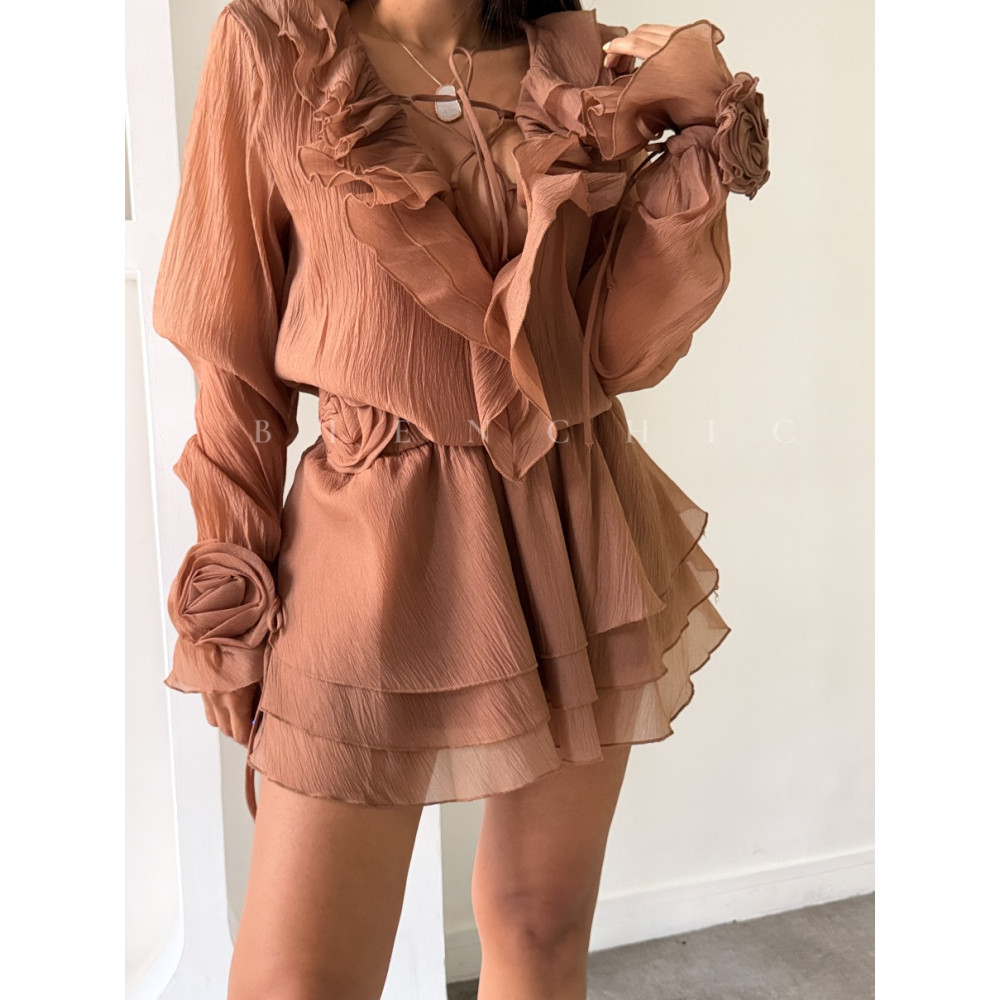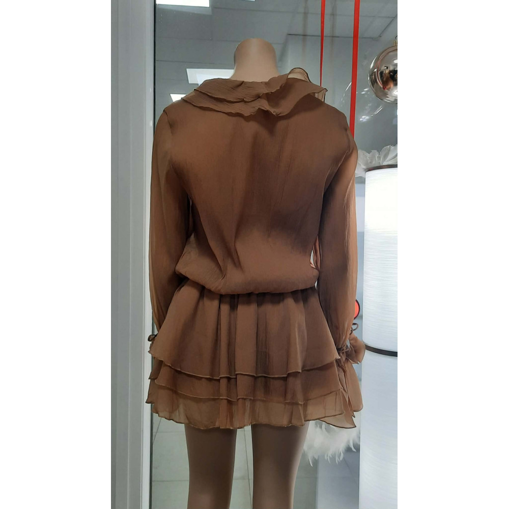 Barna színű, tölcsér ujjú, fodoros, derekán és csuklóban gumírozott,...