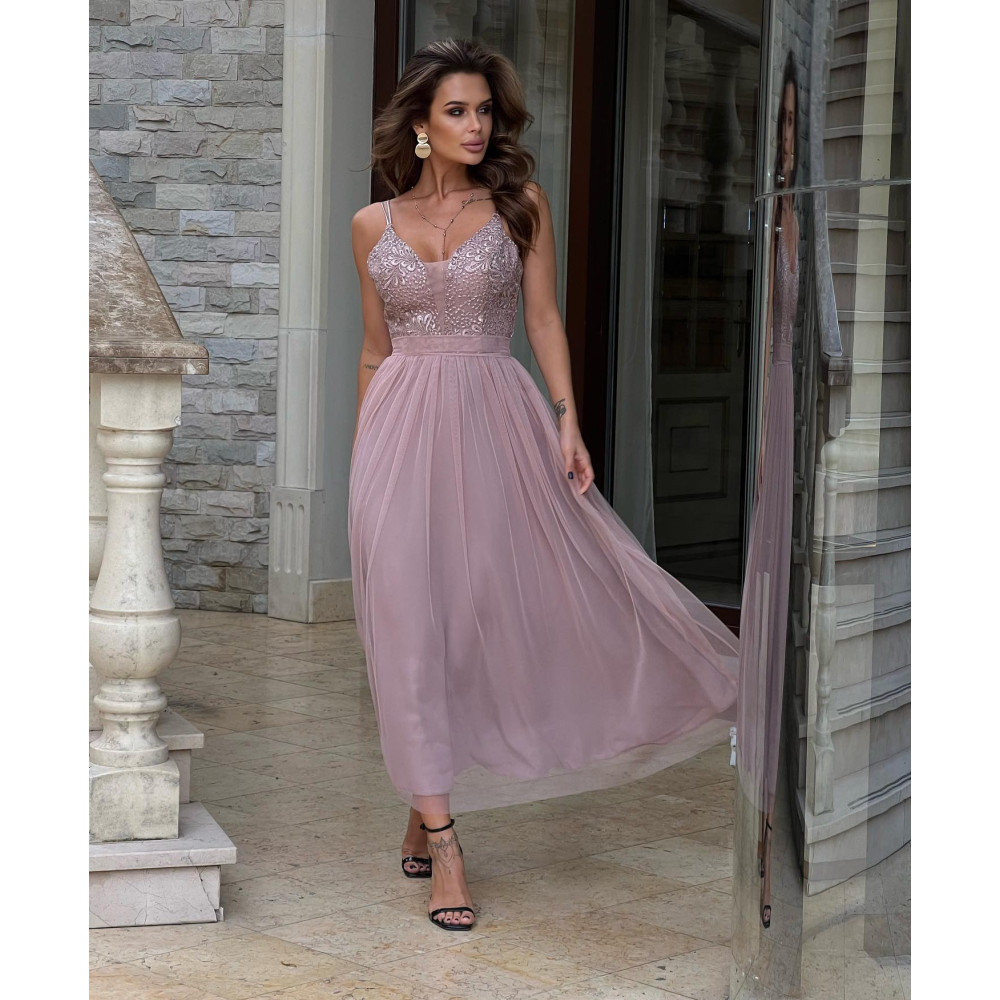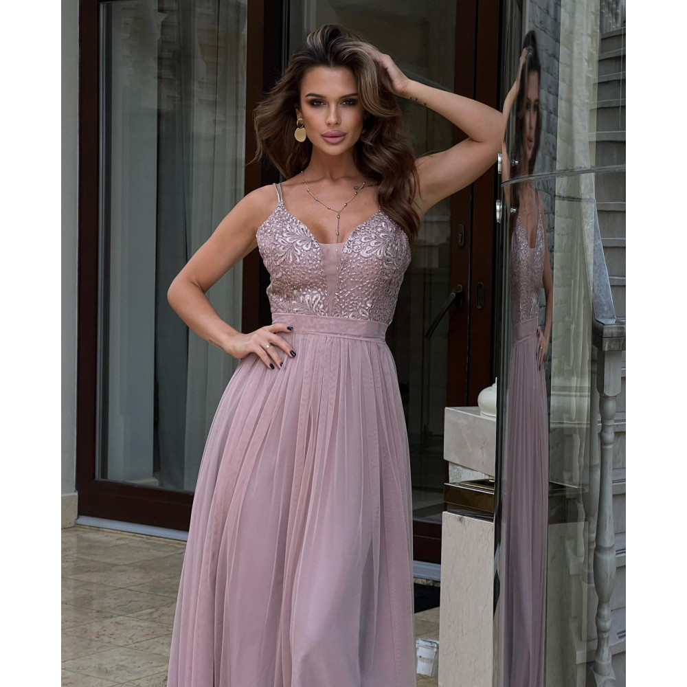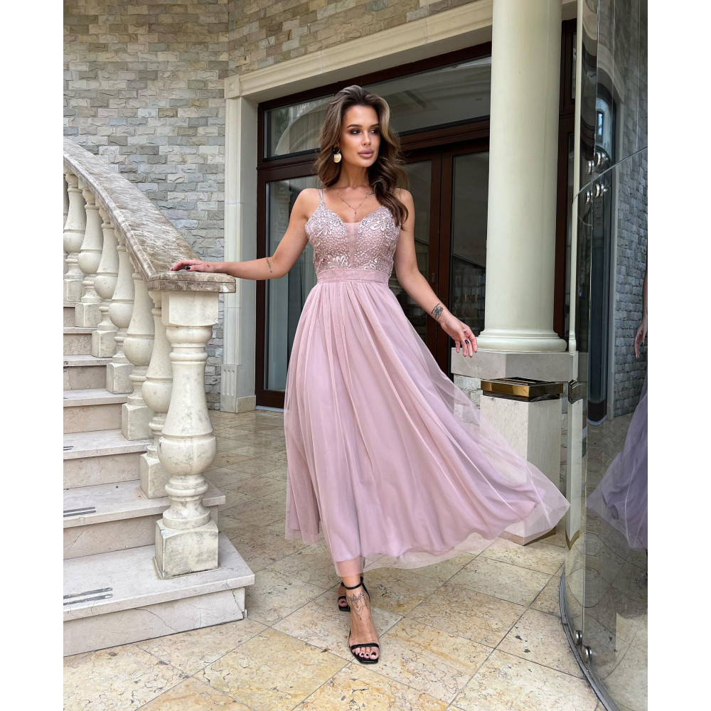 Púder színű tüllös ruha, púderszínű béléssel. Hátrésze zárt, cipzáras....