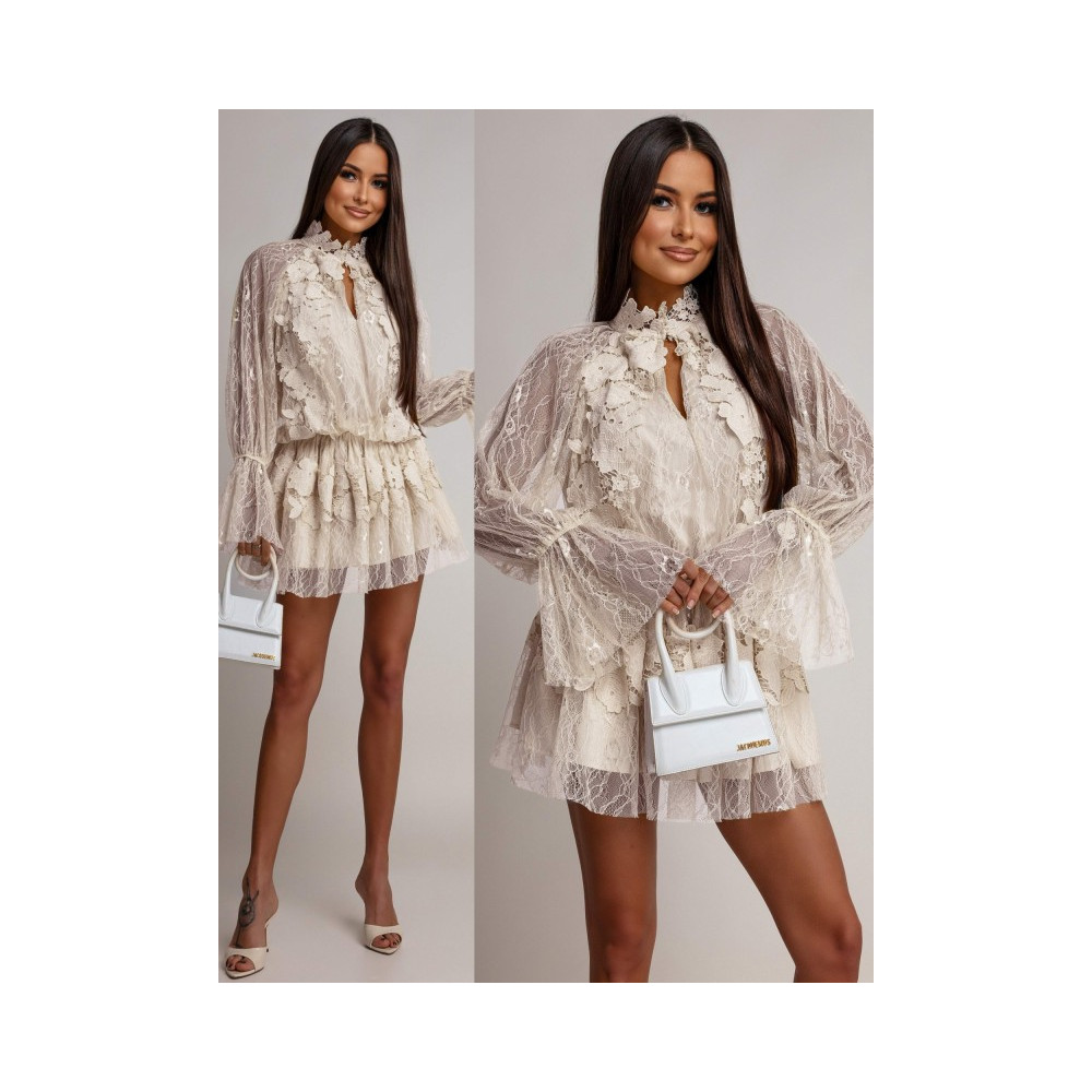 Bézs színű virágokkal díszített fodros csipke ruha, derekán és csuklóban gumírozott. Hátrésze zárt.