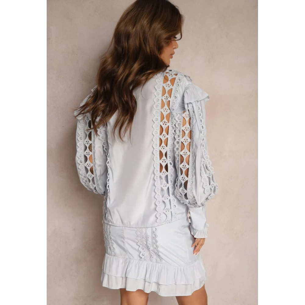 Szürkéskék színű fodros kétrészes madeirás ruha (felső+szoknya).