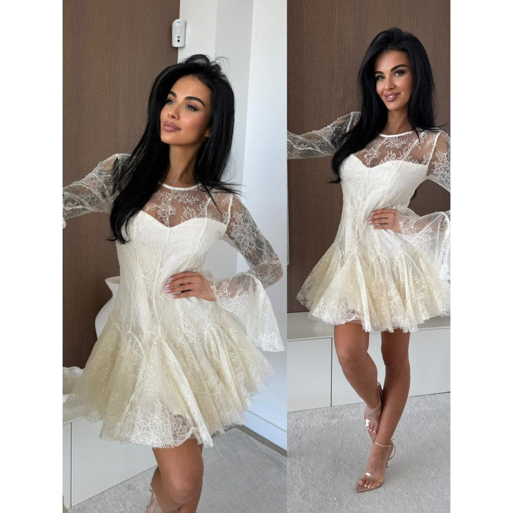 Ecrü színű csipke ruha, hátrésze zárt, belül részben bélelt.