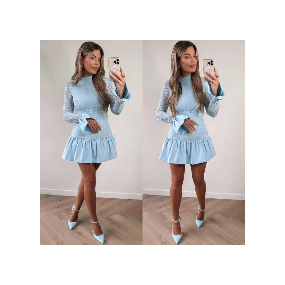 Kék színű, fodros ujjú csipkés ruha, fodros szoknyarésszel. Hátrésze zárt. Rugalmas.