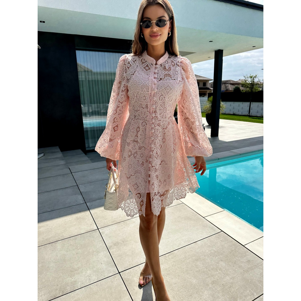 Rózsaszín, buggyos ujjú madeirás ruha, bélelt, hátrésze cipzáras.